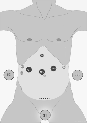 The patient is positioned in a semi-Fowler’s position with legs apart. Under general anesthesia, using a Veress needle (Ethicon Endo-Surgery Inc., Cincinnati, OH) inserted in the left hypochondriac region the pneumoperitoneum is induced at a pressure of 14 mm Hg and the trocars are inserted under direct vision. The surgeon is placed between the patient’s legs, with an assistant on each side, as shown in Figure 1. The trocar positioning used by our team has been previously described in our previous article describing our artery-first approach (6).