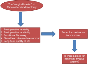 Pancreaticoduodenectomy (PD) is still considered to be one of the most technically complex procedures in digestive surgery. Coeliac and mesenteric vessels surround the anatomical location of the pancreas, so dissection of the pancreas is a specialized task. Since PD can potentially lead to digestive and pancreatic fistulas with consequent tissue and vessels erosions, patients need to be cared for in specialized high-volume units tended by well-trained physicians. The occurrence of such complications, which are prevalent and characterized by high mortality, requires prompt intervention by multidisciplinary teams (surgeons, interventional radiologist, and gastrointestinal (GI) endoscopist) (1,2). Physical recuperation from these complications, which sometimes require reoperation, can be particularly long and delay adjuvant chemotherapy, which consequently impacts cancer-related survival (3,4). Additionally, since digestive anatomy is largely modified by PDs, malabsorption and malnutrition can be common in the short and long term, which impacts quality of life and survival (5,6). All the above-mentioned issues indicate the current need to lessen the “surgical burden” of PDs (Figure 1). Could minimally invasive surgery (MIS) fulfill this need?