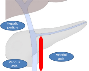 PD presents a unique peculiarity. Pancreatic resection requires specialized proficiency in dissection around the venous and arterial vessels of the coeliac and mesenteric system, which can be the source of perioperative life-threatening bleeding. The reconstructive phase of PD requires extensive experience to perform since leaks from pancreatic, bile, and gastric anastomoses are the main determinants of postoperative mortality and morbidity. The learning curve of PD is steep; a surgeon typically needs to perform 60 cases before they will have developed the surgical skills to perform a PD with reduced blood loss, operative time, and length of hospital stay (7). From a technical point of view, the dissection phase presents its own difficulties when using laparoscopy. PD is, in fact, a multi-quadrant procedure in which at least three different quadrants can be identified (Figure 2). The hepatic pedicle stands longitudinally to the surgeon’s view and the venous and the arterial axes are both located above and below the transverse mesocolon. While the venous axis is superficially located, the arterial axis is more deeply located, and its dissection can be particularly challenging in obese patients. The dissection of these three quadrants requires meticulous placement of the operative trocars and scope in order to achieve precise dissection.