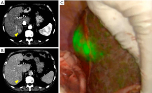 ICG cholangiography is effective for visualizing the confluence of the left and right hepatic duct, decreasing the potential risks of bile duct injury or stenosis (16). After the liver resection, ICG fluorescence imaging can be used for detection of bile leakage on raw hepatic surfaces (16). Marino et al. reported a 1:1-ratio case-matched cohort study of robotic liver resection, in which the surgical outcomes of 25 patients undergoing ICG cholangiography were compared with those of the group not receiving ICG cholangiography. Despite a similar operative time, the rates of postoperative bile leakage, R1 resection, and readmission were reduced in the group receiving ICG cholangiography (24).